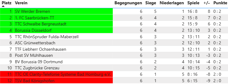 Tabelle der Tischtennis Bundesliga 2025/26 nach dem 6. Spieltag: