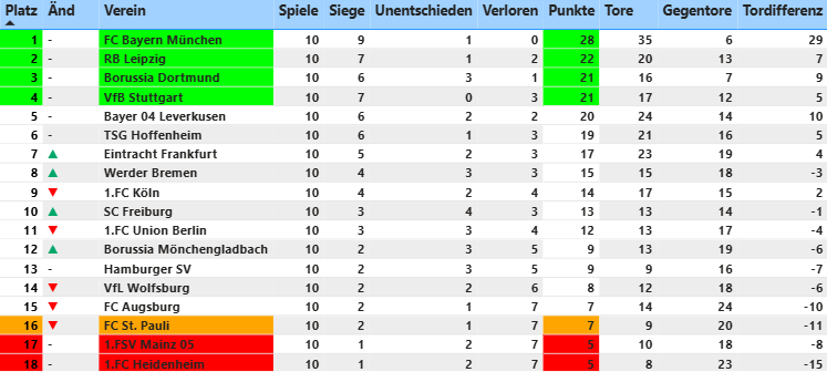 Tabelle der Fußball Bundesliga 2025/26 nach dem 10. Spieltag: