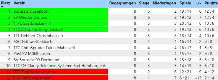 Tabelle der Tischtennis Bundesliga 2025/26 nach dem 8. Spieltag: