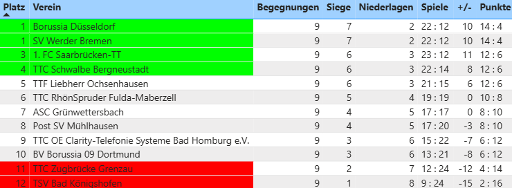 Tabelle der Tischtennis Bundesliga 2025/26 nach dem 9. Spieltag: