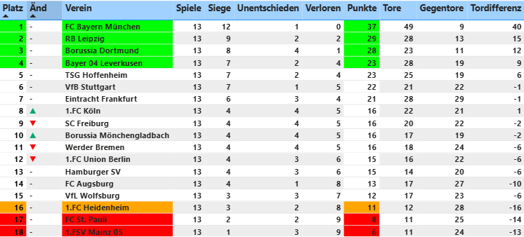 Tabelle der Fußball Bundesliga 2025/26 nach dem 13. Spieltag: