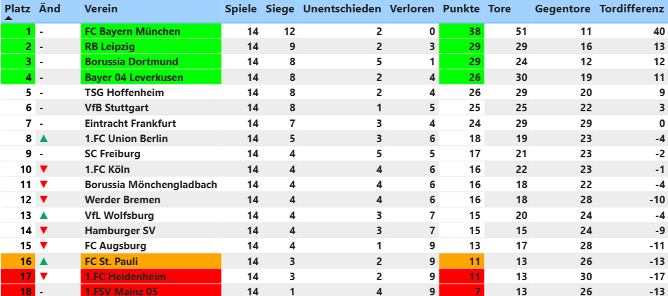 Tabelle der Fußball Bundesliga 2025/26 nach dem 14. Spieltag: