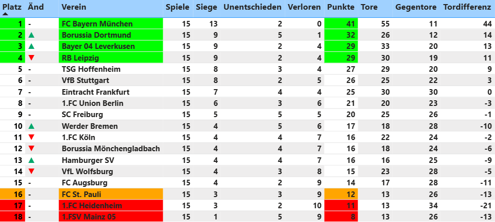 Tabelle der Fußball Bundesliga 2025/26 nach dem 15. Spieltag: