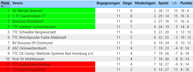 Tabelle der Tischtennis Bundesliga 2025/26 nach dem 11. Spieltag: