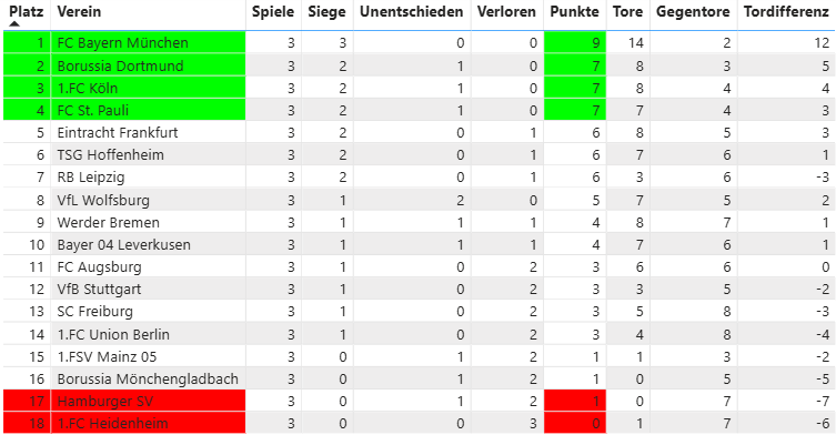 Tabelle der Fußball Bundesliga 2025/26 nach dem 3. Spieltag: