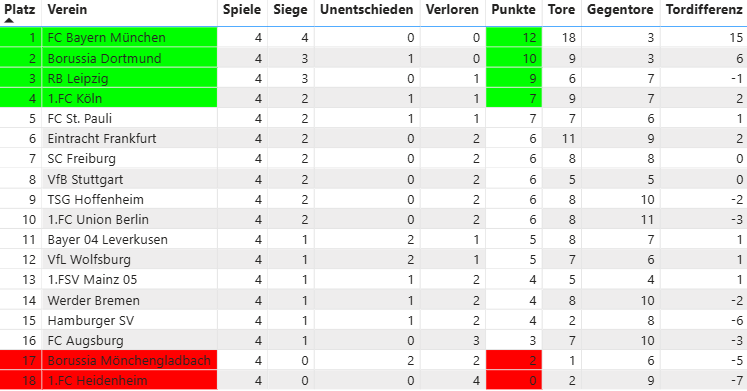 Tabelle der Fußball Bundesliga 2025/26 nach dem 4. Spieltag: