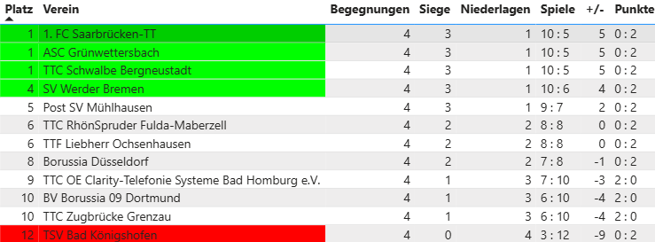 Tabelle der Tischtennis Bundesliga 2025/26 nach dem 4. Spieltag: