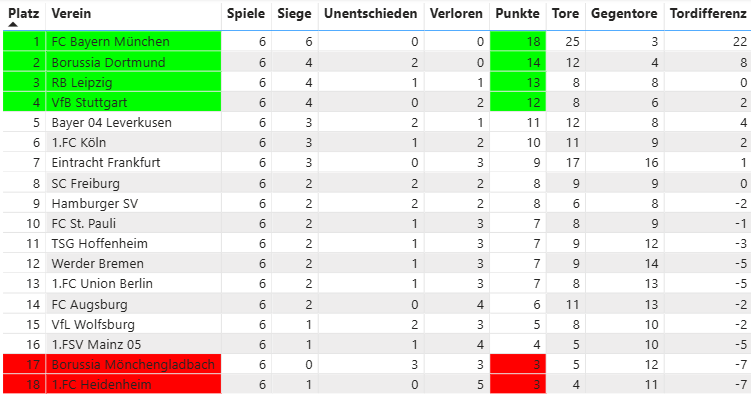 Tabelle der Fußball Bundesliga 2025/26 nach dem 6. Spieltag: