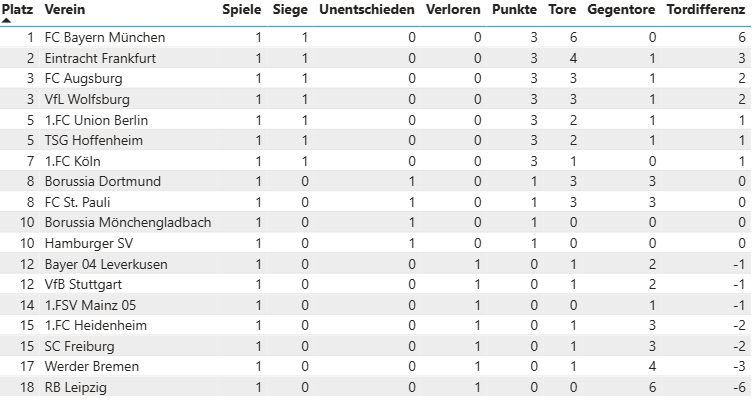 Tabelle der Fußball Bundesliga 2025/26 nach dem 1. Spieltag: